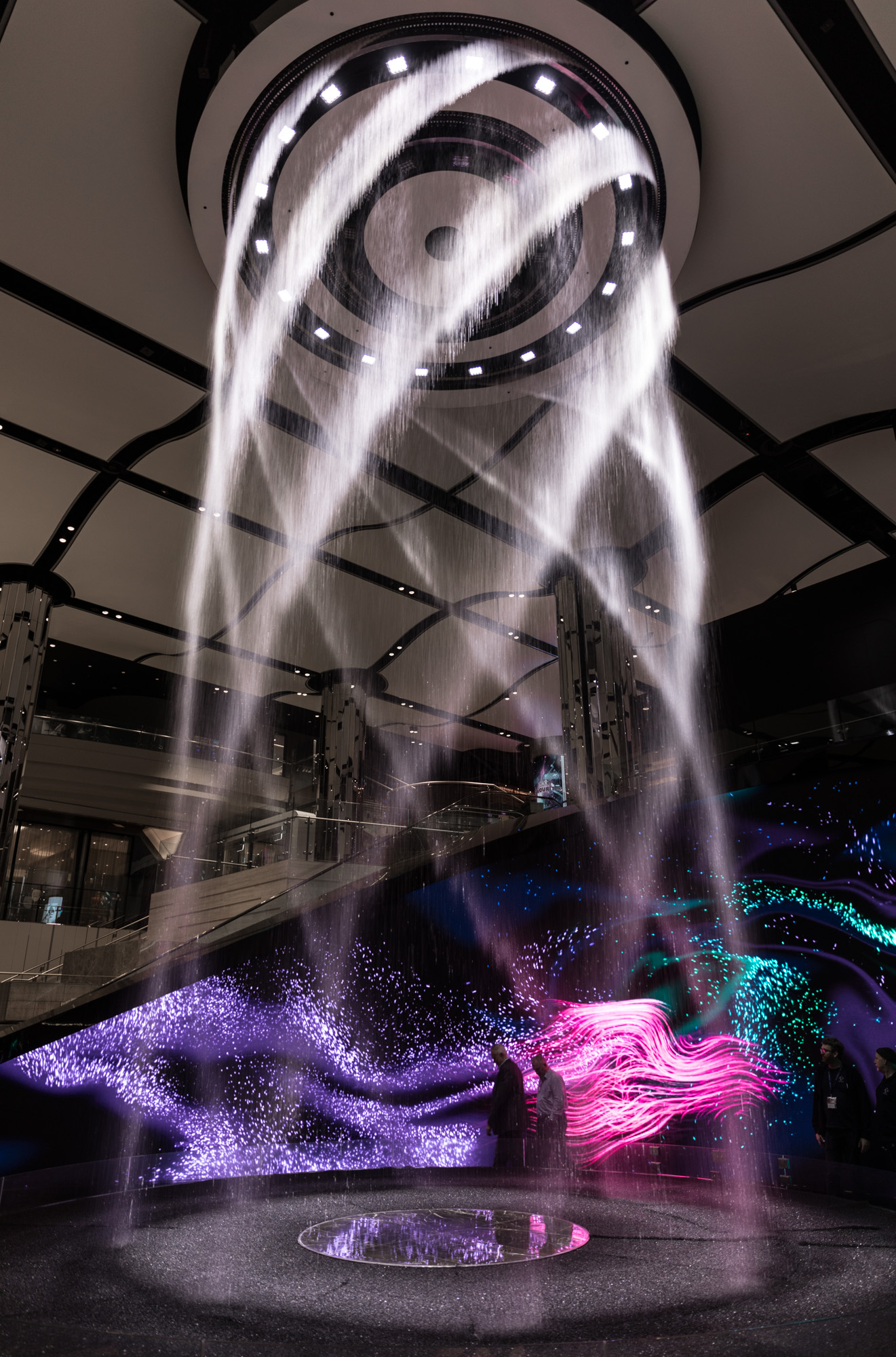 大屏旁的圓柱形裝置使用了洲明雷迪奧系列LED燈條,其靈活特性能夠實現整齊的弧形安裝,通過編程能夠完美呈現不同造型的瀑布,充分展現了空間的靈感躍動。