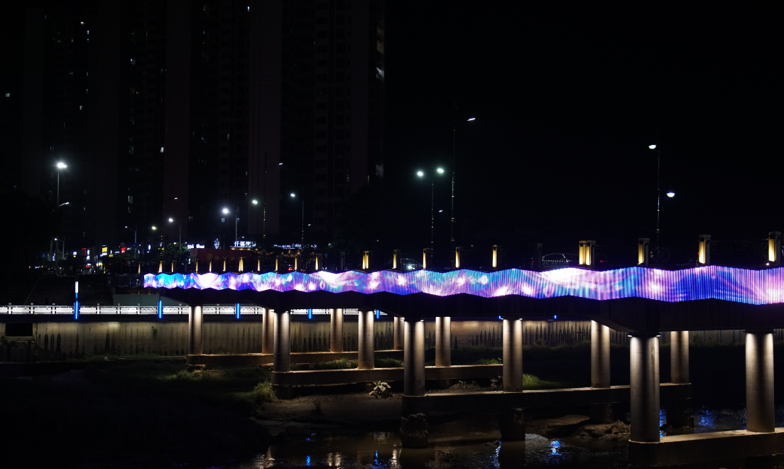 大屏與橋面路燈、兩岸河堤相互照映,以變化的色溫營造出時而統(tǒng)一、時而分離的整體景象,宜動宜靜,恰似一副絕美的風(fēng)景畫。
