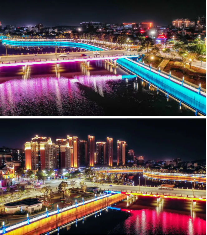 東莞市鳳崗鎮(zhèn)核心主城區(qū)文創(chuàng)燈光項目范圍覆蓋“一河、兩岸、三橋”,分別為石馬河兩岸河堤、綠化帶、步道及臥龍橋、永盛北大橋、永和橋。