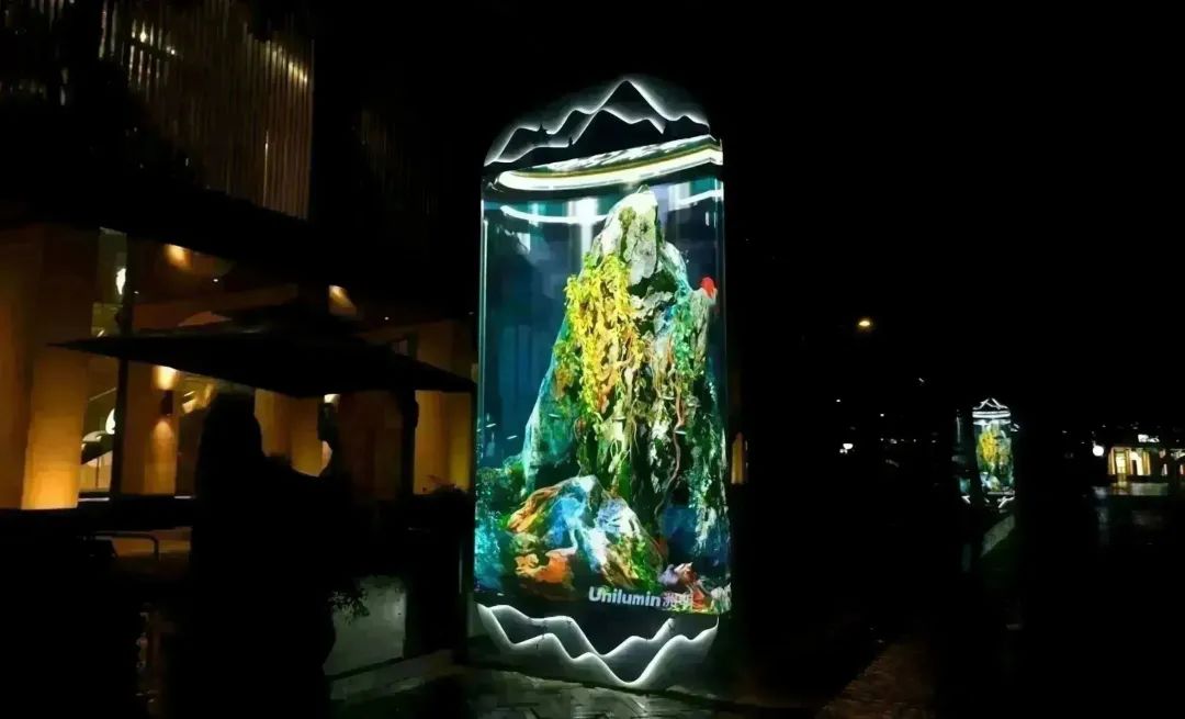 這是全球首款戶外COB產品,沉浸式視效引爆網絡!洲明科技通過應用COB封裝技術,使產品對比度達到12000:1,除了沉浸式的魚缸內容,該屏幕可作為信息展示發布平臺,輪播亞運會、杭州美景等。