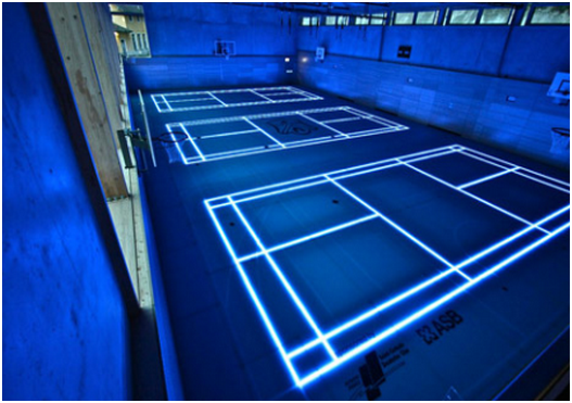 這套采用LED燈的照明系統(tǒng)“ASB glassfloor”而打造的多功能體育場,利用可編程照明室內(nèi)體育場線以及與特定消息下方的面板功能繪制視頻輸出的新型玻璃表面。該系統(tǒng)觸摸一個開關(guān)后可用于照亮不同的場地,適應(yīng)如羽毛球、籃球、室內(nèi)足球、曲棍球、手球及排球等多種體育項目。