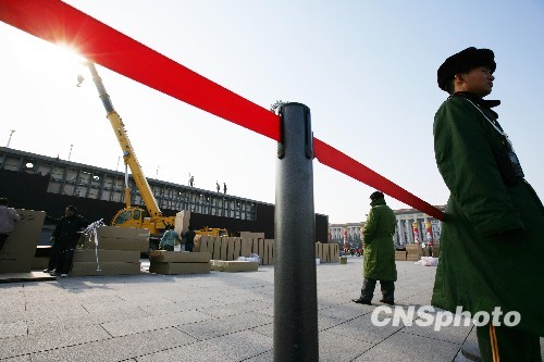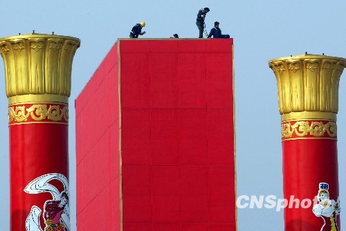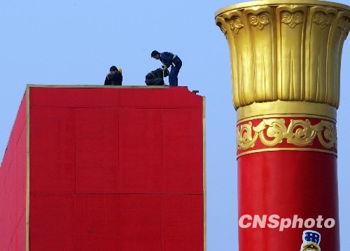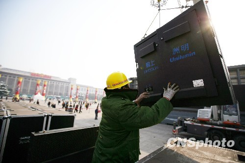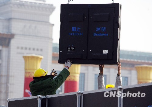 11月13日,位于天安門廣場的四塊巨型LED顯示屏開始拆除,這四塊LED顯示屏在完成建國六十周年大慶任務后走下了舞臺。據工作人員介紹,拆除工作從當日凌晨開始,全部移走要到下周一凌晨左右。中新社發 劉震 攝 轉自:http://news.cctv.com/china/200913/103984.shtml