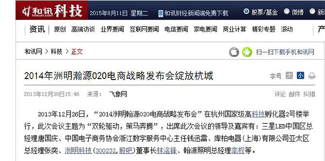 2013年12月26日,“2014洲明翰源O2O電商戰略發布會”在杭州國家級高科技孵化器2號樓舉行,此次會議主題為“雙輪驅動,策馬奔騰”,出席此次會議的領導及嘉賓有:三星LED中國區總經理唐國慶、中國電子商務協會浙江數字服務中心主任錢迅雷、庫柏電器(上海)有限公司亞太區總經理張奕、洲明科技(300232,股吧)董事長林洺鋒、翰源照明總經理李權等。